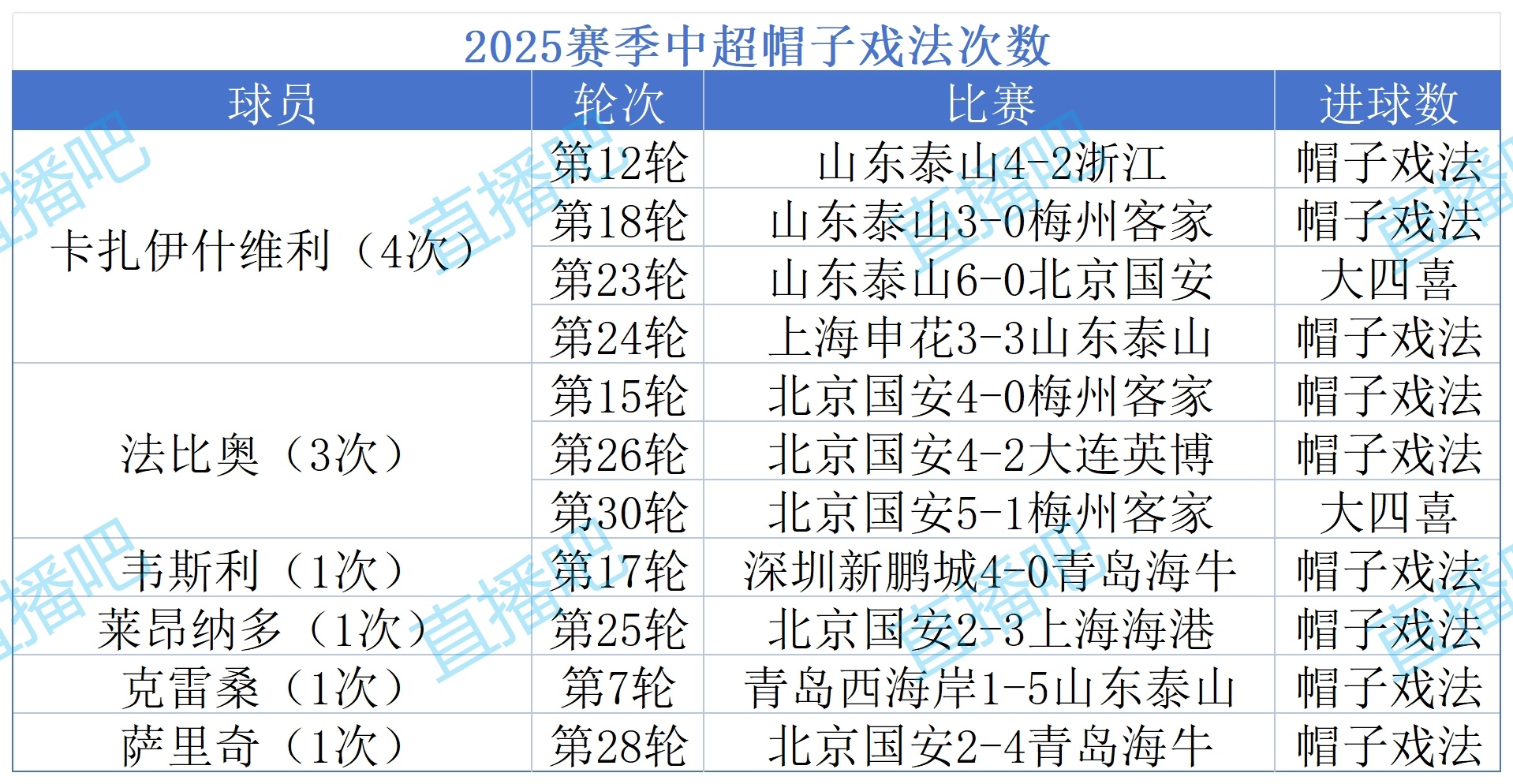 图:2025赛季中超球队队内最佳射手&队内本土最佳射手 本赛季单一球员单场比赛进球最多为4球,山东泰山外援卡扎伊什维利和北京国安外援法比奥,都达成过这个成就。 本赛季一共有6位球员完成过帽子戏法,其中卡扎伊什维利戴帽次数最多,达到了4次(含大四喜)。