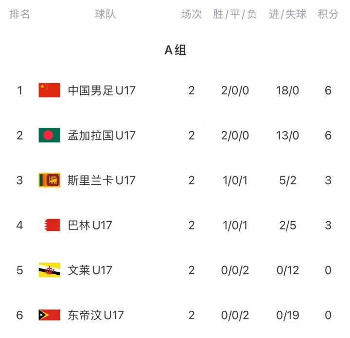 目前,U16国足2战全胜轰18球积6分位列小组第一;文莱2战全负丢12球位列小组倒数第二。 A组积分榜↓