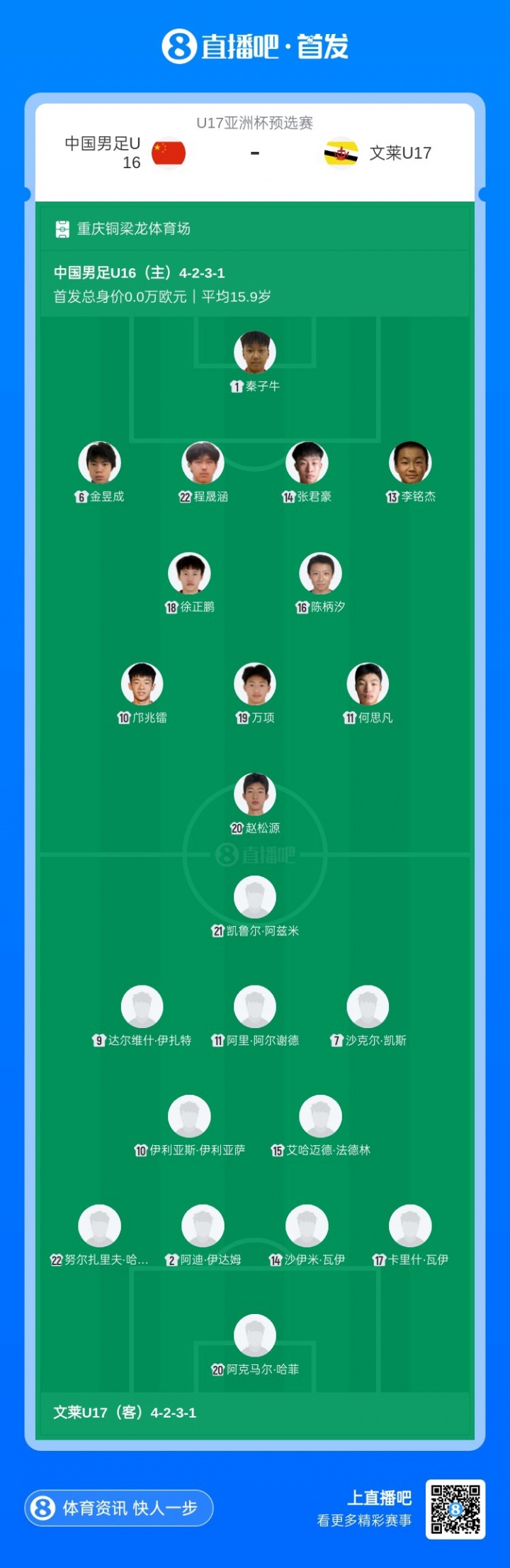 U17亚预赛中国vs文莱首发:邝兆镭先发 万项、赵