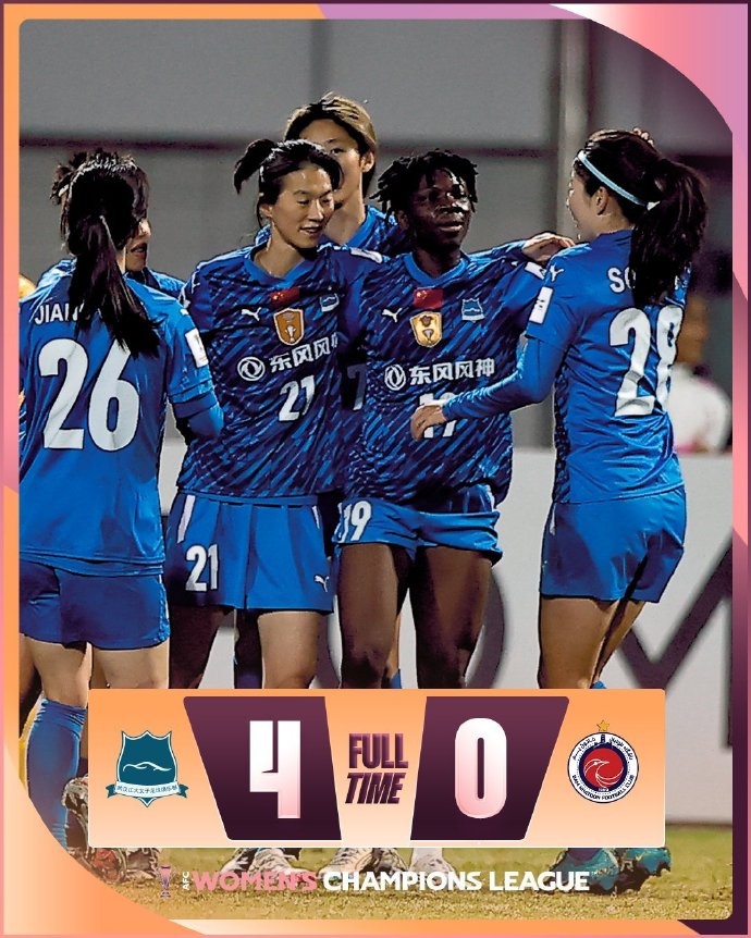 2025年11月23日19:00,女足亚冠联赛小组赛B组第3轮,已经提前出线的武汉车谷江大女足对阵巴姆卡通女足。 上半场补时阶段,奥乌苏接到宋菲的传球,头球攻门打破僵局,武汉车谷江大女足带着1比0的领先进入中场休息。下半场第50分钟,宋菲助攻奥乌苏推射破门完成梅开二度,武汉车谷江大女足两球领先。第55分钟,宋菲上演助攻“帽子戏法”,送出妙传帮助邓梦晔破门,武汉车谷江大女足扩大领先优势。第88分钟,邓梦晔的头球攻门击中门框,赵静宜补射锁定胜局。 最终,武汉车谷江大女足4比0战胜巴姆卡通女足,小组赛2胜1平积7分头名出线。八强赛将在2026年3月进行,届时将重新抽签确定对阵。 图片来源:AFC官方 |