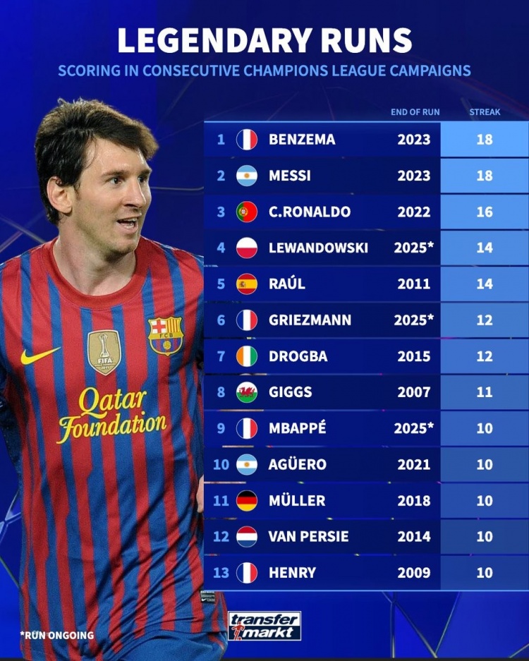 足球比分网11月27日讯 《转会市场》统计了欧冠历史赛季连续进球情况,梅西和本泽马并列居首。 德转列欧冠赛季连续进球榜及截止年份:*为当前仍在继续 1.本泽马,2023年,18赛季 2.梅西,2023年,18赛季 3.C罗,2022年,16赛季 4.莱万多夫斯基,2025年*,14赛季 5.劳尔,2011年,14赛季 6.格列兹曼,2025年*,12赛季 7.德罗巴,2015年,12赛季 8.吉格斯,2007年,11赛季 9.姆巴佩,2025年*,10赛季 10.阿圭罗,2021年,10赛季 11.托马斯·穆勒,2018年,10赛季 12.范佩西,2014年,10赛季 13.亨利,2009年,10赛季
