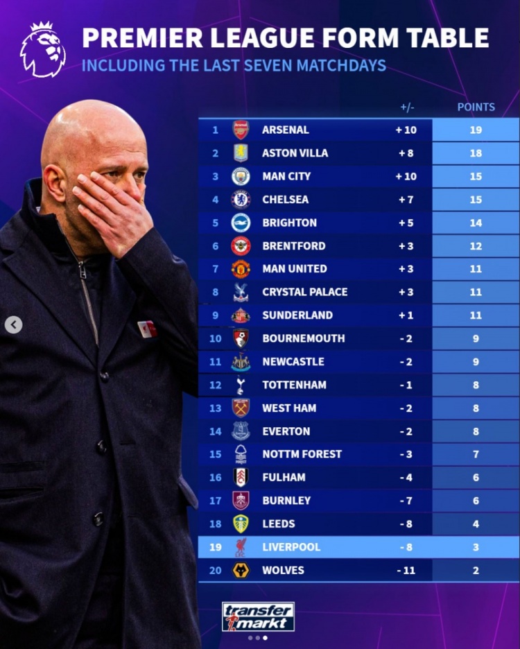 英超各队最近7轮联赛得分:阿森纳19分居首,利