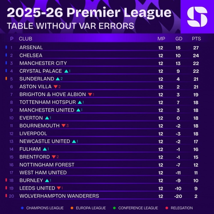足球比分网11月26日讯 数据网站Squawka票选了本赛季英超每周最具争议的VAR判罚,并列出了若无VAR误判的英超积分榜。 1、阿森纳:27分 2、切尔西:24分 3、曼城:22分 4、水晶宫:22分 5、桑德兰:21分 6、维拉:21分 7、布莱顿:19分 8、热刺:18分 9、曼联:18分 10、埃弗顿:18分 11、伯恩茅斯:18分 12、利物浦:18分 13、纽卡:17分 14、富勒姆:16分 15、布伦特福德:15分 16、诺丁汉森林:12分 17、西汉姆:11分 18、伯恩利:10分 19、利兹联:9分 20、狼队:2分