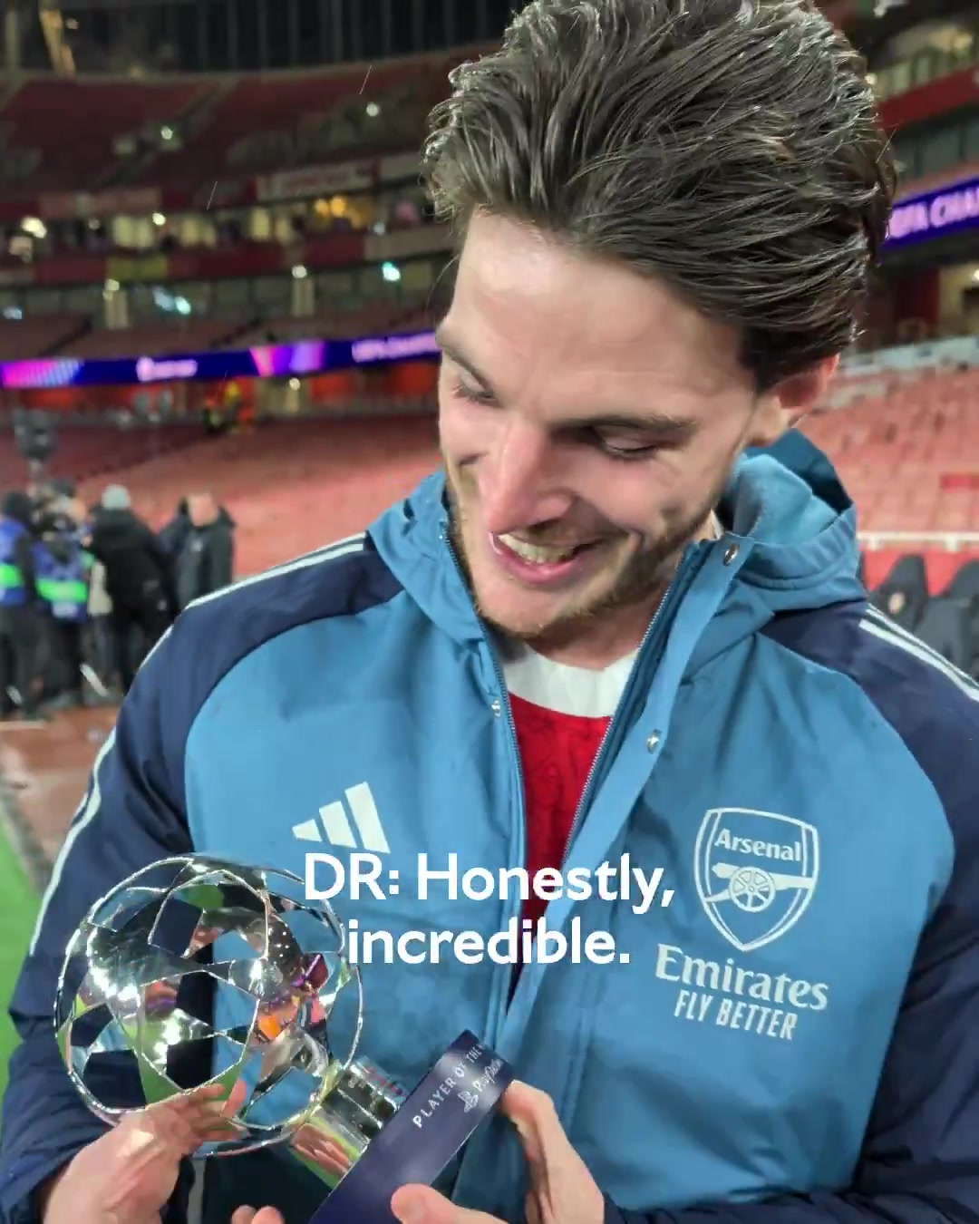 赖斯领取全场最佳奖杯:主场击败拜仁+再次当选