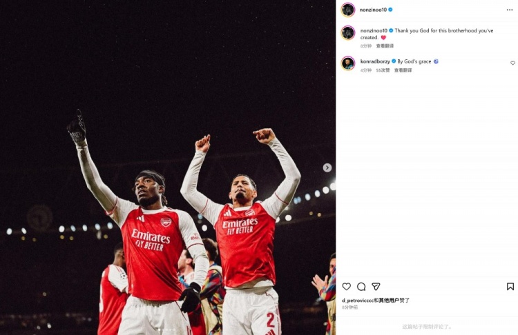 足球比分网11月27日讯 在本轮欧冠,阿森纳3-1击败拜仁。 本场比赛马杜埃凯打进个人阿森纳生涯处子球,赛后他也在社媒晒出与队友庆祝进球的合照,配文写道:“感谢上帝创造如此棒的兄弟情谊!” |