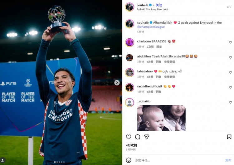 足球比分网11月27日讯 埃因霍温在本轮欧冠4-1客场大胜利物浦,库哈伊布·德里欧替补双响建功。 第73分钟,埃因霍温中场得球,佩皮一路推进至禁区内,随后尝试一脚低射,这球击中近门柱弹出,德里欧补射打进。 第90+1分钟,埃因霍温后场策动进攻,德斯特右路下底倒三角传球,跟进的德里欧推射得手。 欧冠官方也在赛后将其评选为本场MVP,他也在赛后通过社媒晒出自己高举MVP奖杯的照片并配文:“真主至大!❤️在欧冠对利物浦打进2球!” |