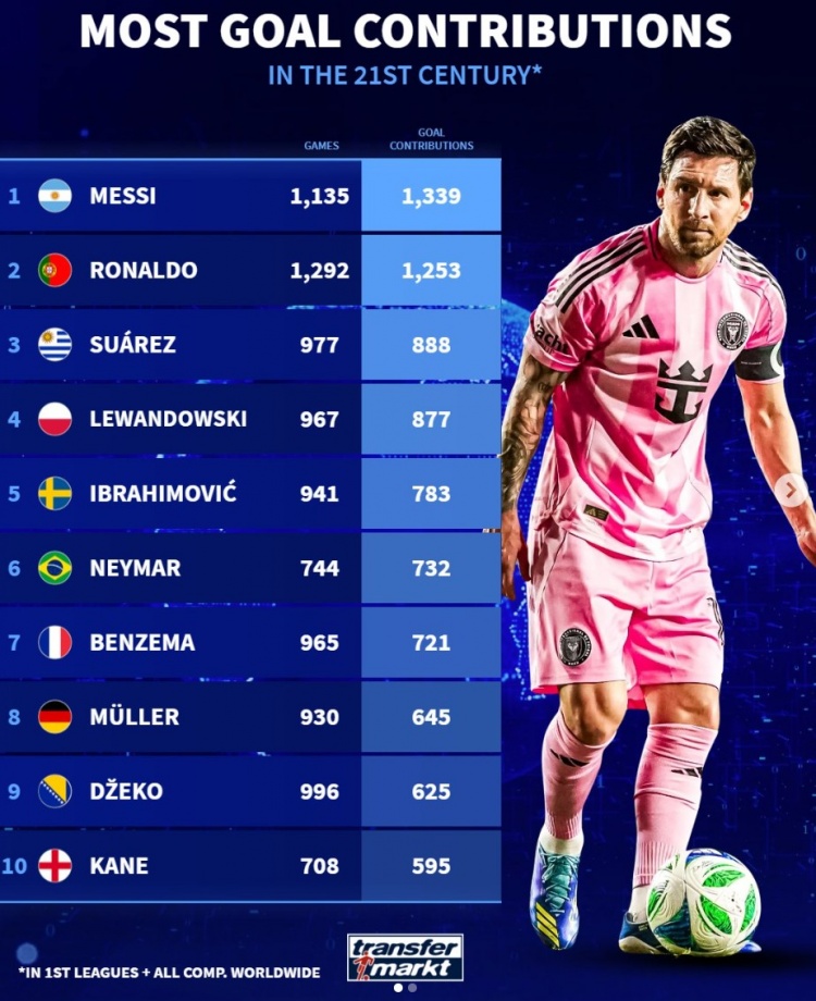 德转列新世纪参与进球榜:梅西1135场造1339球 C罗