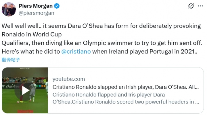 此外,摩根还曾表示C罗比赛中肘击的爱尔兰队后卫奥谢早有前科,他曾在世预赛故意挑衅C罗而被后者击打手臂。