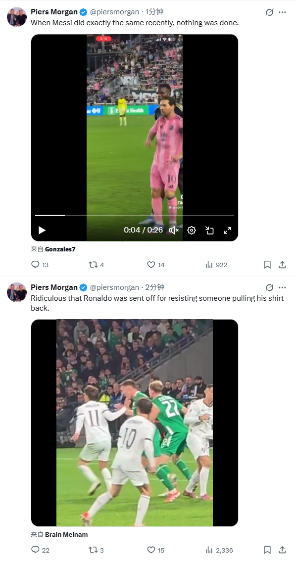 足球比分网11月26日讯 多家媒体报道,C罗因在对阵爱尔兰的比赛中吃到的直红,将被FIFA处以3场禁赛,但其中两场为缓期进行,这也意味着C罗将不会因此次染红错过明年世界杯的正赛。 对此,名嘴/C罗好友摩根再度在个人社媒转发相关报道声援C罗:“正确的判定。他当时是在对抗别人拉扯他的球衣。” 此前,摩根曾在社媒多次声援染红的C罗,分别晒出C罗与梅西的视频,并表示C罗因为对抗他人拉扯球衣而被红牌罚下非常荒谬,此外梅西最近类似的动作却没有遭到惩罚。