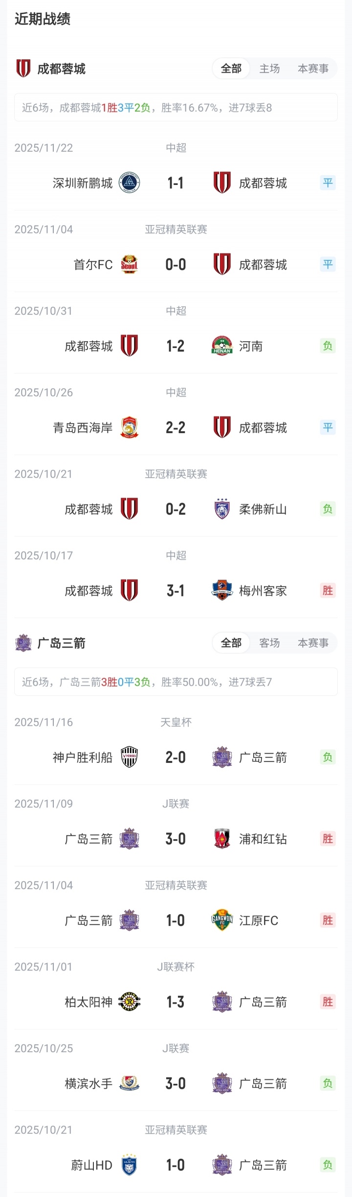 【近期战绩】 亚冠精英联赛东亚区积分榜上,成都蓉城1胜1平2负积4分,位列第11;广岛三箭2胜1平1负积7分,位列第3。