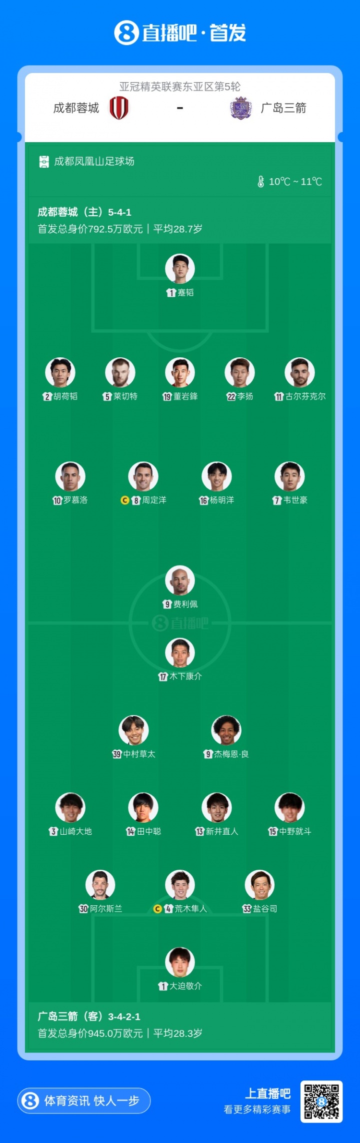 主力尽出!亚冠-蓉城vs广岛首发:韦世豪、罗慕