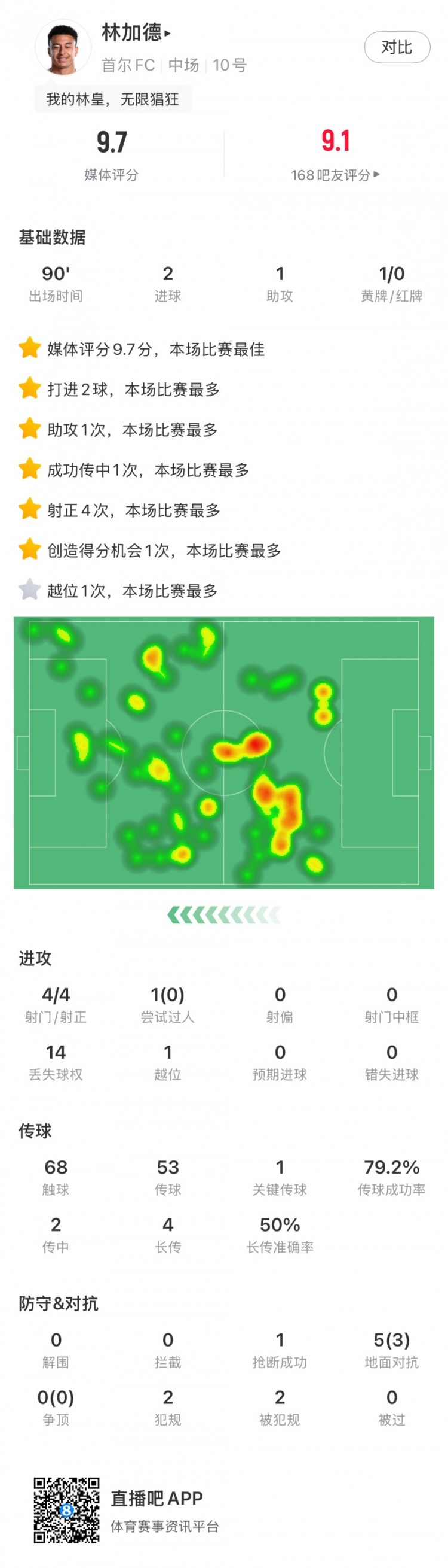足球比分网11月25日讯 亚冠精英联赛东亚区第5轮,上海海港主场1-3不敌首尔FC,继续小组垫底。 本场比赛“林皇”林加德直接参与首尔FC全部进球,贡献2射1传,赛后踢满全场的他获得了全场最高的9.7分。 林加德全场数据如下: 评分9.7分 出场时间90分钟,2进球1助攻 射门4次,射正4次 尝试过人1次 丢失球权14次,越位1次 触球68次,传球53次,传球成功率79.2% 关键传球1次 传中2次,长传4次,长传准确率50% 抢断成功1次 地面对抗5次,成功3次 犯规2次,被犯规2次 |