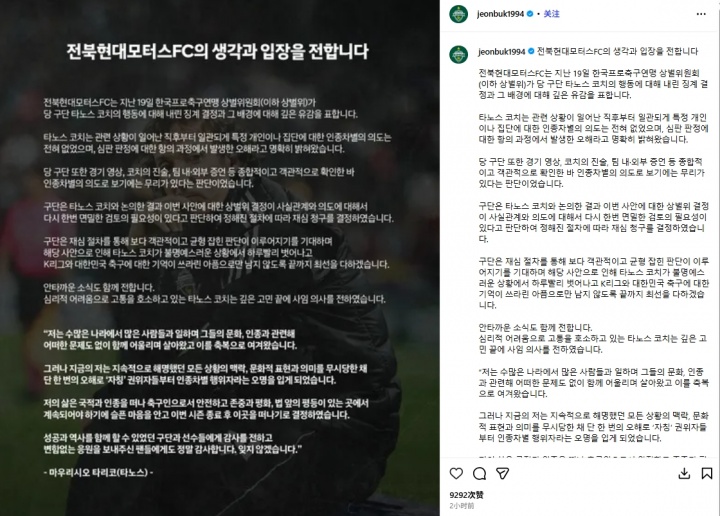 足球比分网11月25日讯 此前全北现代阿根廷助教拉眼角,被韩国裁判协会禁赛5场,今日全北现代官方发布公告,表示对这一结果深表遗憾,并将提出上诉,同时助教宣布辞职,将在赛季结束离队。 【相关新闻】全北助教疑似做“拉眼角”动作,裁判协会控诉种族歧视 全北现代官方公告 全北现代对韩国职业足球联盟奖惩委员会,于19日就本俱乐部教练塔诺斯相关行为作出的惩戒决定及其背景深表遗憾。 塔诺斯教练自相关事件发生后始终明确表示,其行为绝无针对特定个人或群体的种族歧视意图,而是在对裁判判罚提出异议过程中产生的误解。 俱乐部通过综合、客观核实比赛录像、教练陈述及球队内外部证言等信息后判断,相关行为难以认定存在种族歧视意图。 经与塔诺斯教练商议,俱乐部认为奖惩委的此次决定有必要就事实真相与行为意图再次进行缜密审查,因此决定依据法定程序申请再审。 俱乐部期待通过再审程序得出更客观、均衡的判断,并将全力以赴,助力塔诺斯教练尽快摆脱此次不名誉的处境,避免该事件仅给 K 联赛及韩国足球留下痛苦的回忆。 在此同步告知一则令人遗憾的消息:因承受巨大心理压力而深感痛苦的塔诺斯教练,经深思熟虑后已提出辞职。 教练辞职声明 “我曾在多个国家与不同人士共事,始终能够跨越文化与种族差异和睦相处,从未产生任何相关问题,并始终将这份经历视为一种幸运。 然而如今,在我持续解释事件背景、文化表达及深层含义却被全然无视的情况下,仅因一次误解,便被所谓的‘权威人士’贴上了种族歧视者的污名。 我的人生应当超越国籍与种族的界限,作为一名足球人,在安全、受尊重、充满和平且法律面前人人平等的环境中继续前行。因此,我怀着悲痛的心情决定,在本赛季结束后离开这里。 感谢与我一同创造辉煌成就与历史的俱乐部及球员们,也向始终坚定不移支持我的球迷们致以最诚挚的谢意。我将永远铭记这份情谊。”