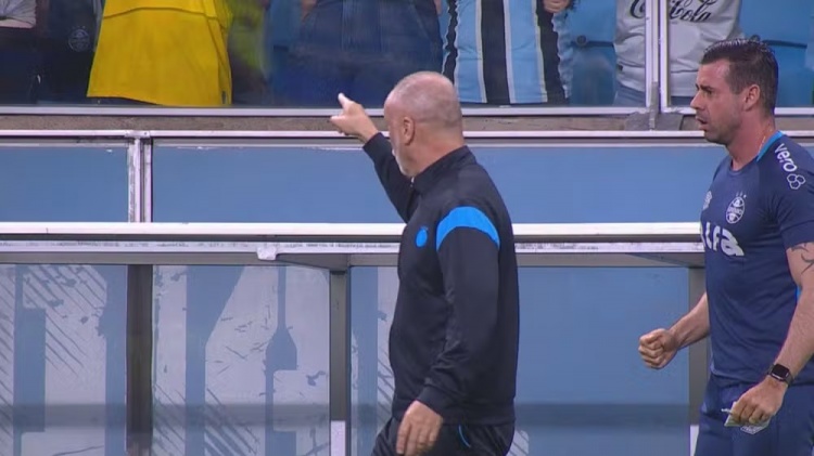 攻入扳平进球后,格雷米奥主帅向坐在替补席后