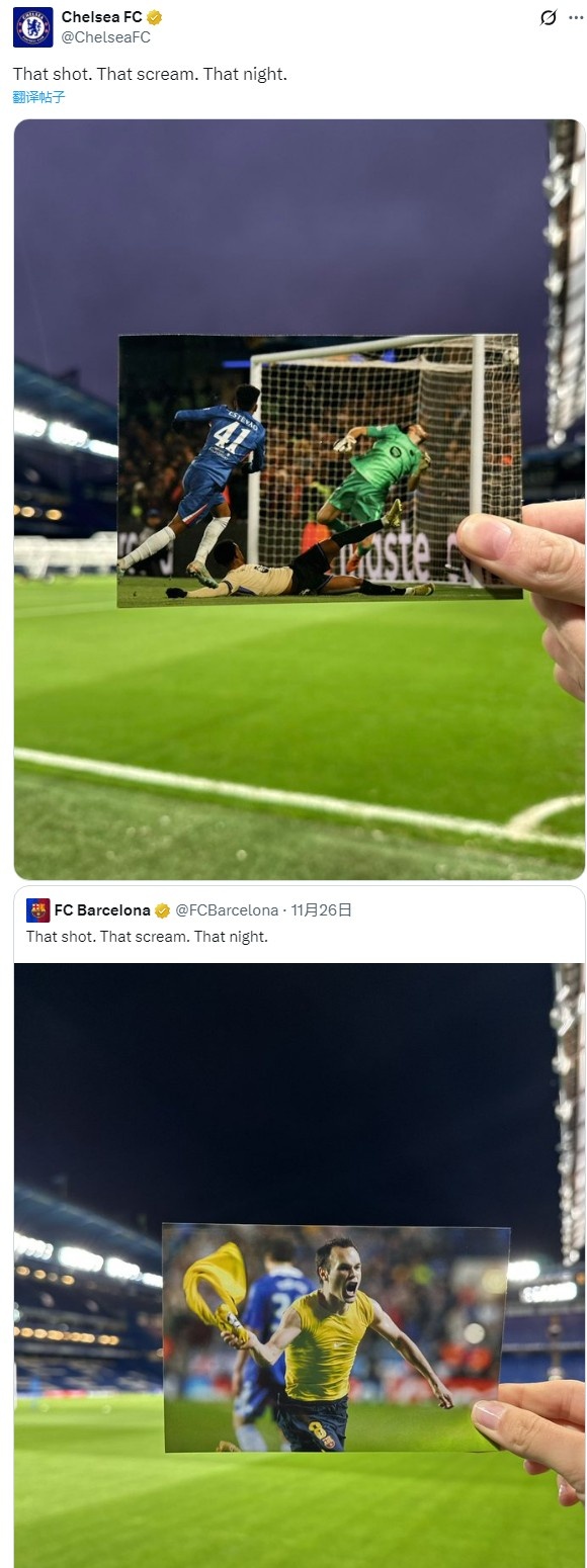 巴萨晒伊涅斯塔绝杀蓝军照片,赛后切尔西以埃