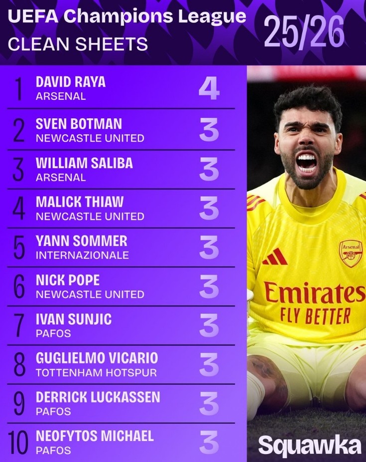 足球比分网11月27日讯 本赛季欧冠5轮战罢,数据网站Squawka盘点了本赛季目前零封场次榜,具体如下: 1、拉亚(阿森纳) 4次 2、博特曼(纽卡)3次 3、萨利巴(阿森纳)3次 4、佳夫(纽卡)3次 5、索默(国米)3次 6、波普(纽卡)3次 7、桑吉克(帕福斯)3次 8、维卡里奥(热刺)3次 9、卢卡森(帕福斯)3次 10、米歇尔(帕福斯)3次 |
