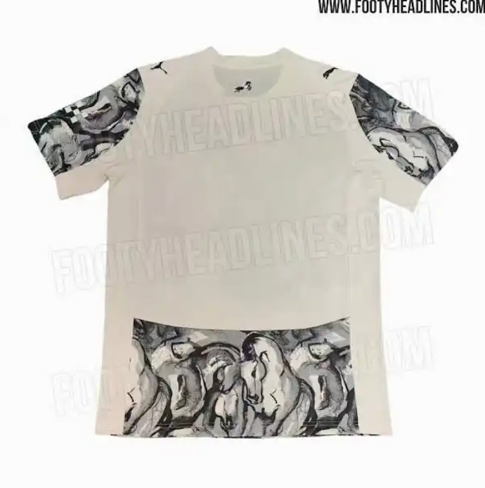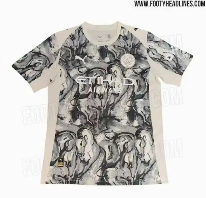 足球比分网11月28日讯 footyheadlines消息,彪马为曼城设计的马年球衣近日被提前泄露。 这款球衣以米色为主色调,正面和背面部分都有密集的抽象马头图案,设计灵感来源于中国传统水墨画。该款球衣旨在庆祝2026年的中国农历新年,特别是即将到来的马年(2026年2月17日开始)。