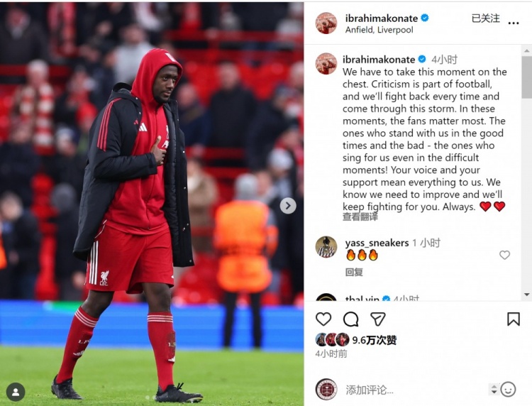 足球比分网11月28日讯 欧冠联赛阶段第5轮比赛,利物浦主场1-4不敌埃因霍温。 利物浦中卫科纳特社媒写道:“我们必须坦然面对此刻的困境,批评是足球的一部分,但我们每次都会奋起反击,最终渡过这场风暴。” “此刻,球迷们最为重要——那些无论顺境逆境都与我们同在的人,那些在艰难时刻仍为我们放声高歌的人!你们的声音与支持对我们意义非凡。我们深知球队需要进步,并将永远为你们而战。” |