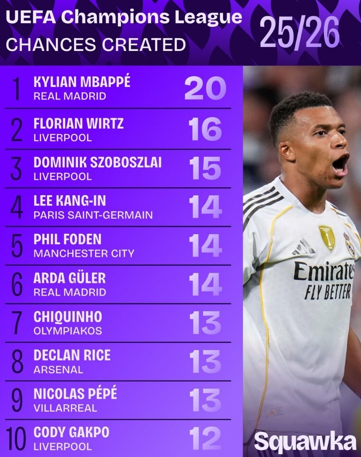 足球比分网11月27日讯 本赛季欧冠5轮战罢,数据网站Squawka盘点了本赛季欧冠创造机会榜,具体如下: 1、姆巴佩(皇马)20次 2、维尔茨(利物浦)16次 3、索博斯洛伊(利物浦)15次 4、李刚仁(巴黎)14次 5、福登(曼城)14次 6、居莱尔(皇马)14次 7、奇奎尼奥(奥林匹亚科斯)13次 8、赖斯(阿森纳)13次 9、佩佩(比利亚雷亚尔)13次 10、加克波(利物浦)12次