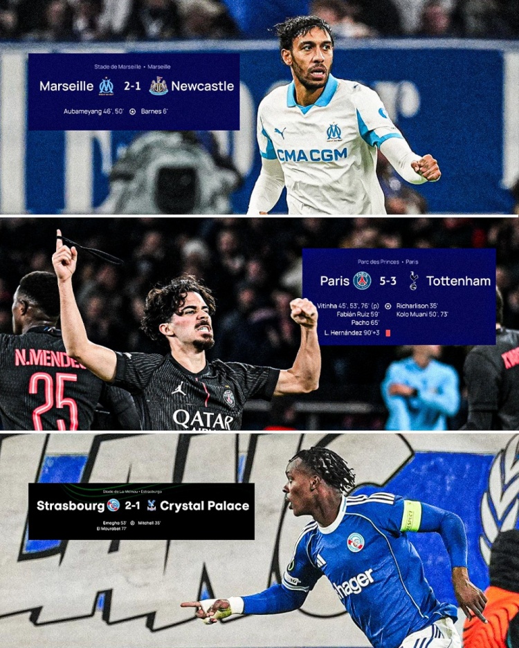 足球比分网11月28日讯 法甲官方更新社媒动态,晒出本周欧战三胜英超球队的海报。 本周欧战马赛、巴黎、斯特拉斯堡三支法甲球队都战胜了英超对手,法甲官方社媒晒出海报庆祝。 三支法甲球队具体战绩: 马赛2-1纽卡 巴黎5-3热刺 斯特拉斯堡2-1水晶宫 |