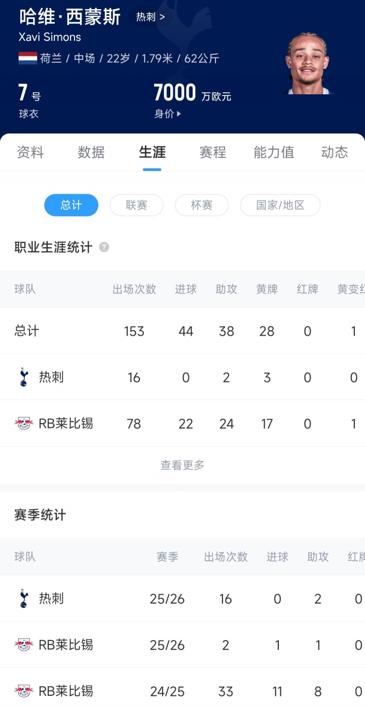 足球比分网11月27日讯 欧冠联赛阶段第5轮,热刺客场3-5负于巴黎圣日耳曼,近6场比赛仅取得1胜,热刺中场西蒙斯本场比赛只得到13分钟出场时间。 本赛季加盟热刺后,哈维·西蒙斯已经代表球队出战了16场比赛,出场时间937分钟,仅贡献2次助攻,没有取得进球,热刺的战绩相比开季时也急转直下。 今年夏窗,热刺花费6500万欧元,从RB莱比锡签下哈维·西蒙斯,西蒙斯与热刺签下了一份5年的合同,周薪19.5万英镑(约22万欧元)。目前22岁的西蒙斯德转身价为7000万欧元。