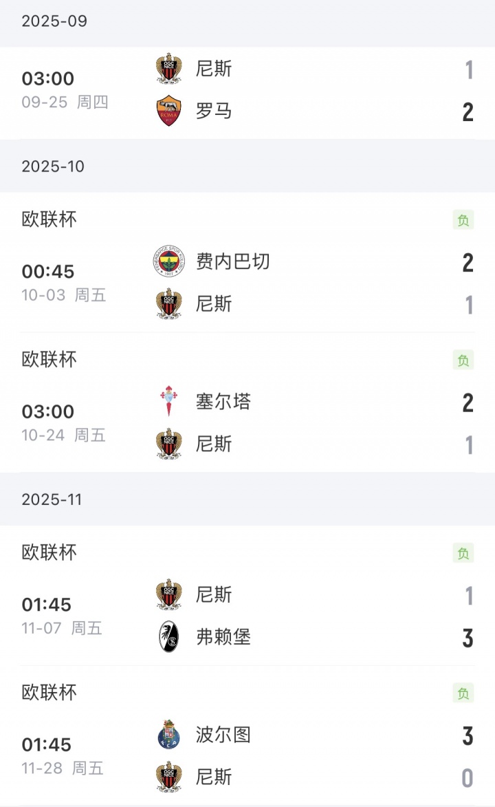足球比分网11月28日讯 本周欧战结束,尼斯成为法甲7支参赛球队中唯一输球球队,尼斯欧协联0-3惨败波尔图,5战全败垫底。 【欧冠】 巴黎5-3热刺 马赛2-1纽卡 帕福斯2-2摩纳哥 【欧联】 波尔图3-0尼斯 里尔4-0萨格勒布迪纳摩 特拉维夫马卡比0-6里昂 【欧协联】 斯特拉斯堡2-1水晶宫