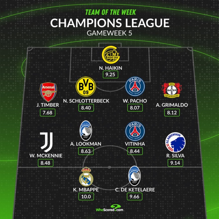 WhoScored欧冠第5轮最佳阵:姆巴佩领衔,廷伯、德