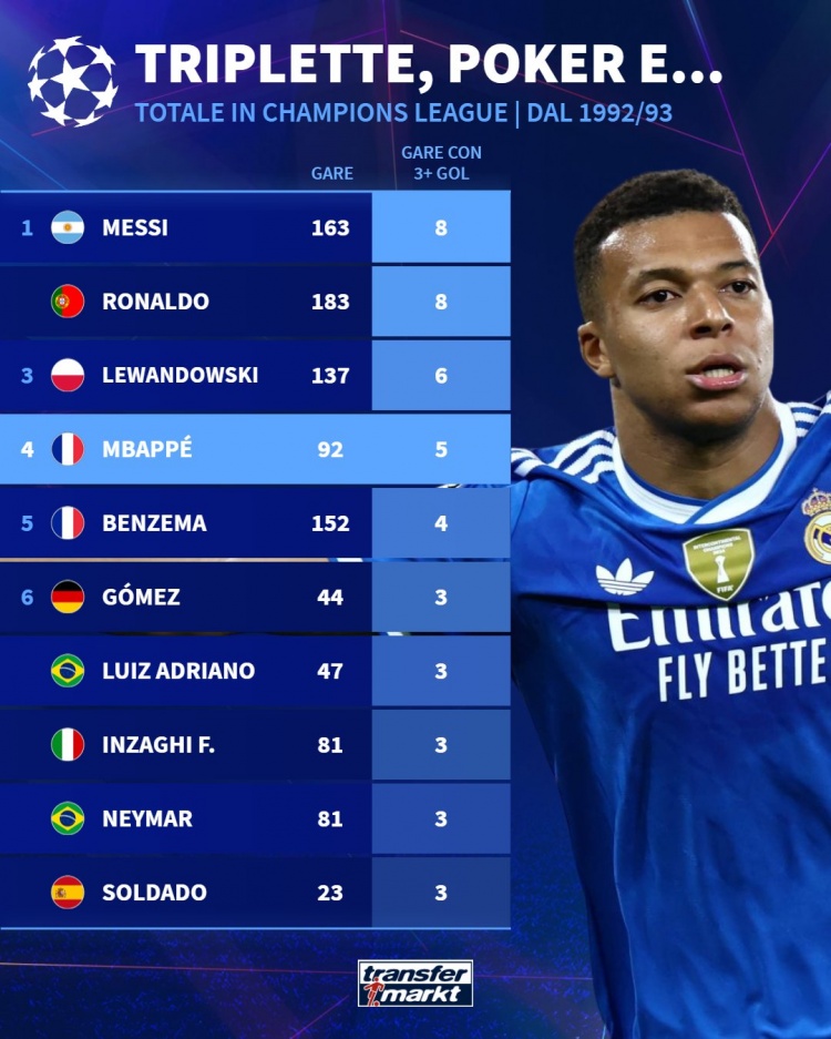 足球比分网11月27日讯 德国转会市场统计了1992-1993赛季欧冠改制以来球员单场进球3+的场次,并列出榜单,梅西、C罗8场居首,莱万6场、姆巴佩5场。 欧冠改制以来单场进球3+场次榜: 梅西——8 C罗——8 莱万——6 姆巴佩——5 本泽马——4 戈麦斯——3 阿德里亚诺——3 因扎吉——3 内马尔——3 索尔达多——3