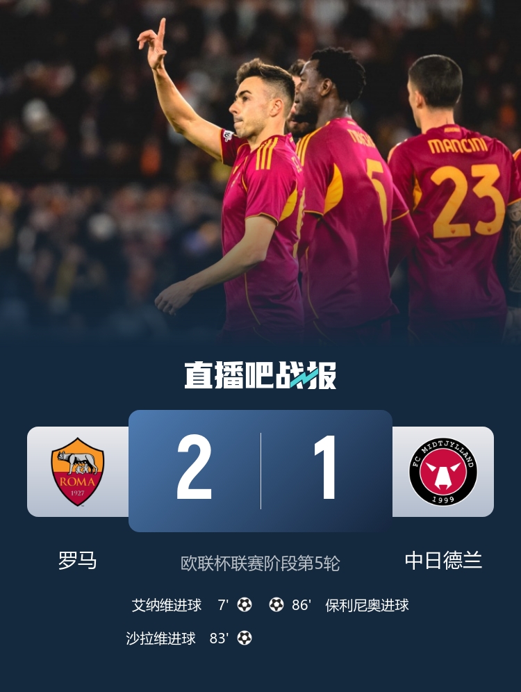 足球比分网11月28日讯 罗马在欧联杯2-1击败中日德兰,再次取得了1球小胜。 在2025年的所有赛事中,罗马20次以1球的优势取得胜利,五大联赛只有皇马的次数比罗马更多,皇马一共23次取得1球小胜。
