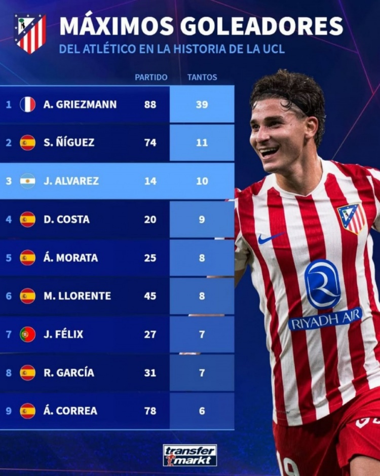 马竞队史欧冠进球榜:格列兹曼居首,阿尔瓦雷