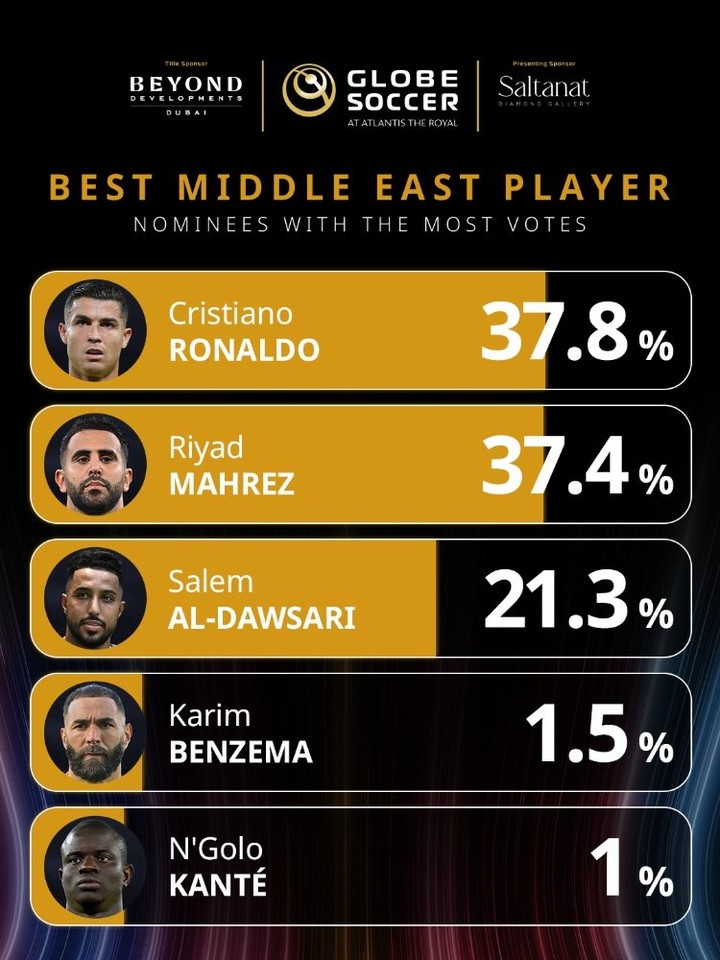 环足奖最佳中东球员投票:C罗37.8%领跑,本泽马