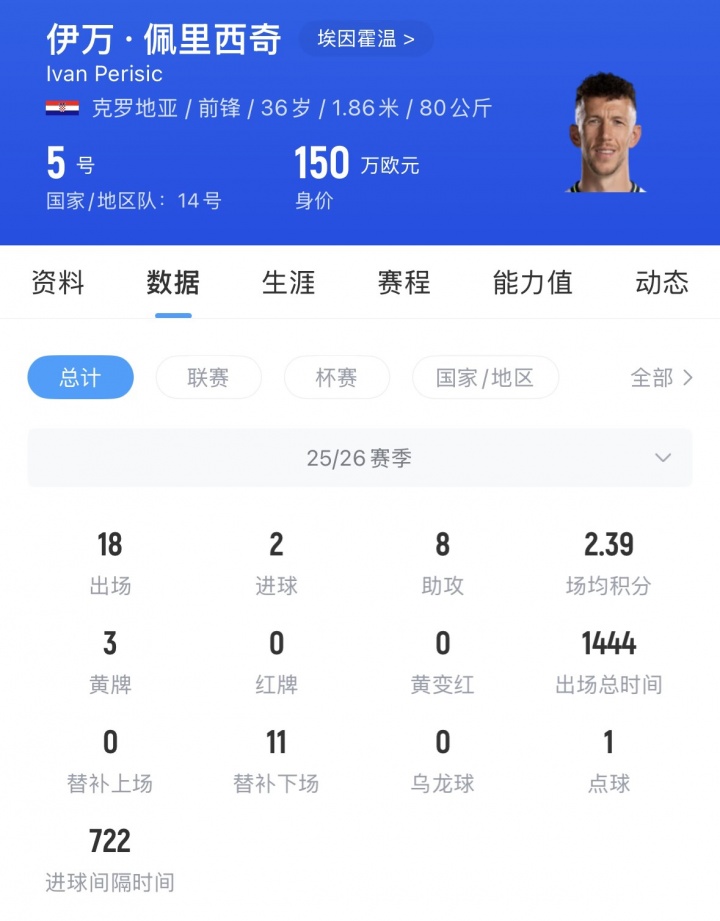 还有油?36岁佩里西奇本赛季18场2球8助,对利物
