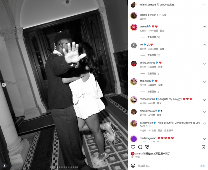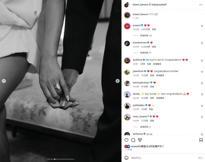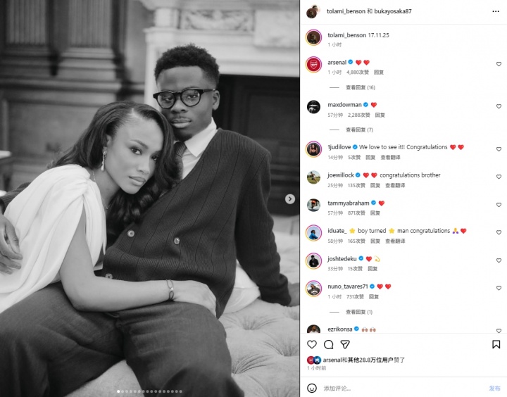 足球比分网11月29日讯 一小时前,阿森纳边锋萨卡在个人社媒上晒出了一组黑白滤镜的照片动态,宣布了自己与女友托拉米订婚成功的喜讯。 这则帖子也得到了萨利巴、加布里埃尔、埃泽等队友以及阿森纳官方的评论祝贺。 《太阳报》对此报道称,萨卡在伦敦一家顶级酒店的浪漫约会中与女友完成了订婚,而萨卡的动态配文“17.11.25”正是求婚的日期。二人从2020年开始交往,至今已有5年。