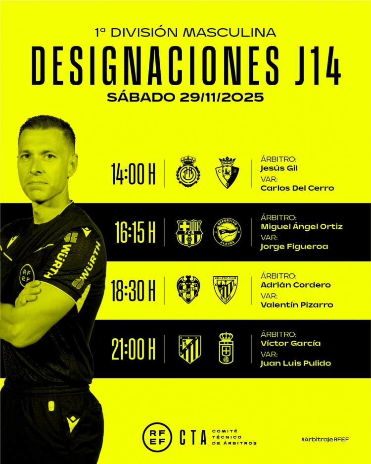 足球比分网11月28日讯 西甲官方公布了11月29日4场比赛的裁判安排。 西甲11月29日比赛裁判安排: 马洛卡vs奥萨苏纳——主裁:热苏斯·吉尔,VAR裁判:德尔塞罗 巴萨vs阿拉维斯——主裁:奥尔蒂斯,VAR裁判:菲格罗亚 莱万特vs毕尔巴鄂竞技——主裁:科尔德罗,VAR裁判:瓦伦丁·皮萨罗 马竞vs皇家奥维耶多——主裁:维克托·加西亚,VAR裁判:普利多 |
