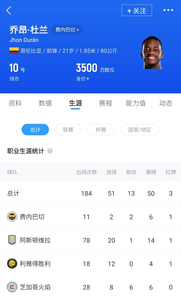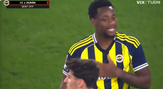 足球比分网11月28日讯 欧联杯联赛阶段第5轮,费内巴切1-1战平费伦茨瓦罗斯,费内巴切前锋杜兰在补时阶段头顶对手,被裁判红牌罚下。 2025年1月,杜兰以7700万欧转会费从维拉加盟利雅得胜利,仅仅效力半年后便外租加盟费内巴切,本赛季出战11场比赛,贡献2球2助。