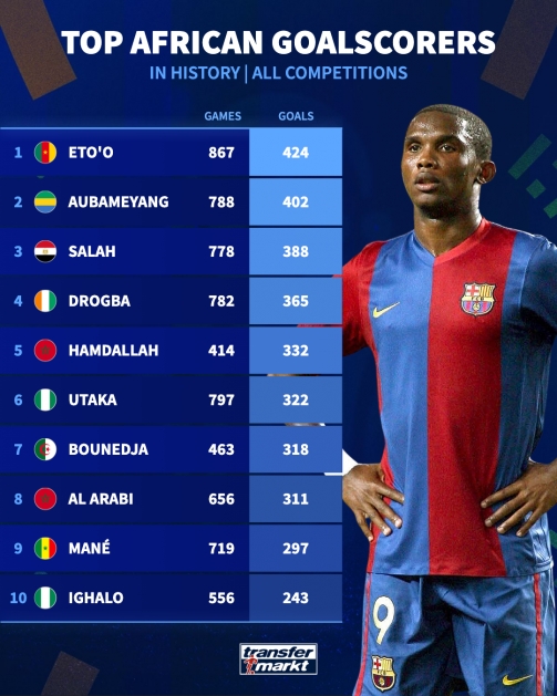 非洲球员历史射手榜:埃托奥867场424球第一,奥