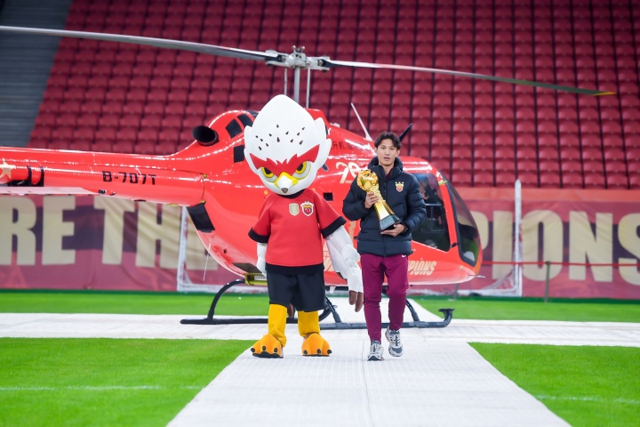 激动人心的夺冠视频过后,大家的目光被静候在内场的临港捷运纪念版直升机吸引,仪式开始前,这架直升机载着王燊超和奖杯从川沙飞抵球场。这一环节不仅是荣耀的展示,更是俱乐部积极探索“低空+足球”体旅融合新范式的生动实践。随后,王燊超与俱乐部总经理沙良昌共同将新赛季冠军奖杯安放于柱顶,与三座往届火神杯组成“冠军奖杯矩阵”,将现场氛围推向高潮。 作为连续两个赛季率队夺冠的功勋教练,穆斯卡特收到了上港集团总裁宋晓东赠送的特别定制竹刻画像,画像中镌刻着他的形象、冠军奖杯及俱乐部二十周年纪念标识,凝结着并肩奋战的珍贵记忆。