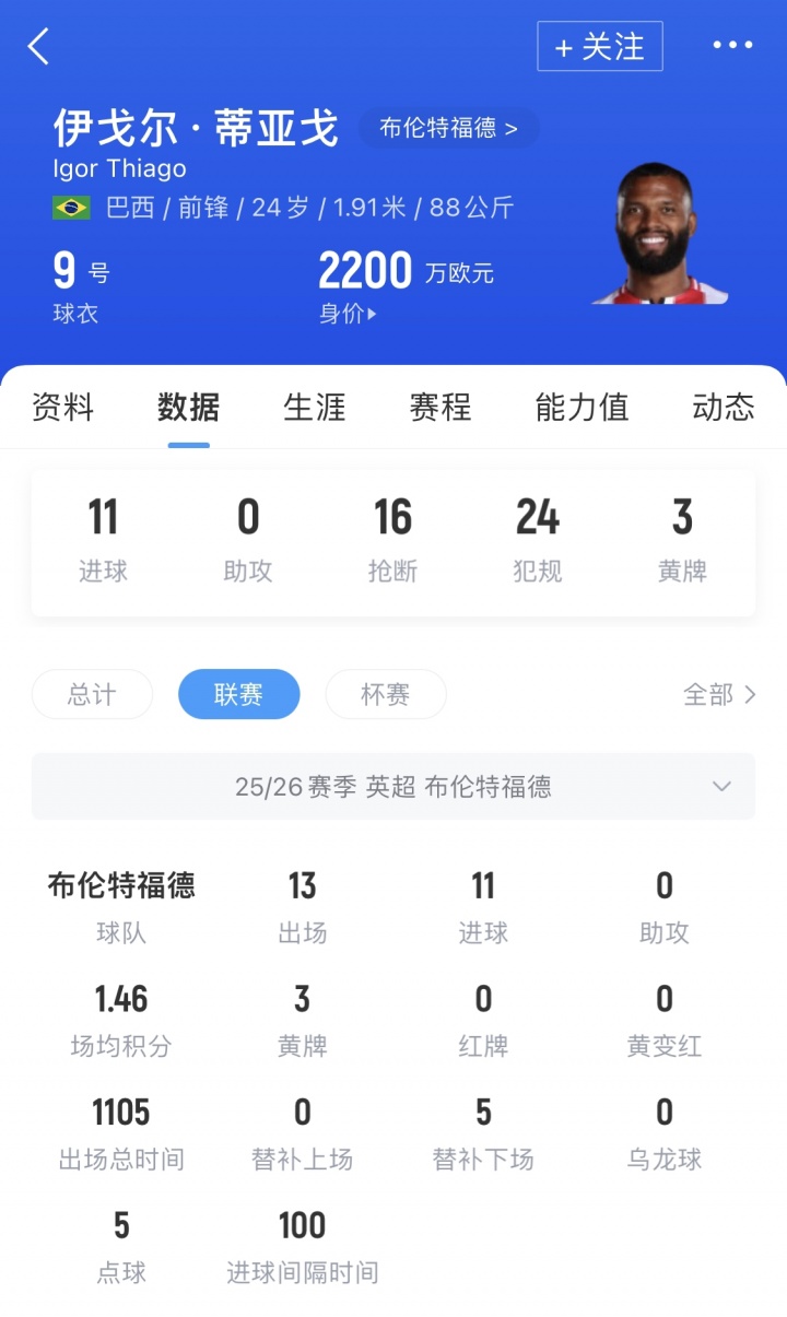 足球比分网11月30日讯 英超第13轮,布伦特福德主场3-1击败伯恩利,伊戈尔·蒂亚戈梅开二度,本赛季英超13轮11球,在射手榜上仅次于哈兰德(14球),各项赛事14场12球进账。 伊戈尔·蒂亚戈目前身价2200万欧,这位1米91分巴西前锋还未得到过巴西国家队的征召。 此前他接受采访的时候明确表示:“我一直梦想着能为巴西效力。我总是祈求上帝,当我入选国家队时,我不希望只是去凑数。当我抵达那里时,我想要站稳脚跟。”
