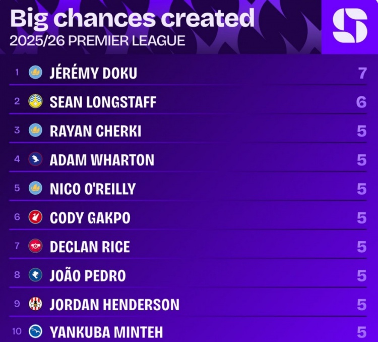 足球比分网11月30日讯 Squawka统计了球员本赛季英超创造重大机会的次数,并列出榜单,多库7次最多。 英超本赛季创造重大机会排名: 多库(曼城)——7 S·朗斯塔夫(利兹联)——6 谢尔基(曼城)——5 沃顿(水晶宫)——5 奥赖利(曼城)——5 加克波(利物浦)——5 赖斯(阿森纳)——5 若昂·佩德罗(切尔西)——5 乔丹·亨德森(布伦特福德)——5 明特(布莱顿)——5