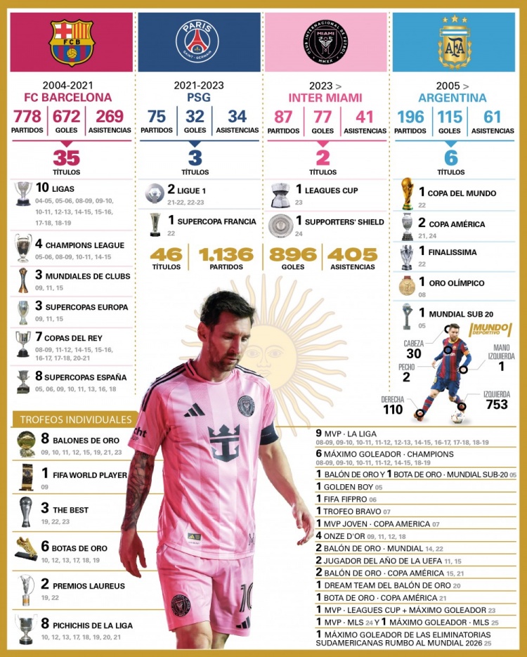 足球比分网11月30日讯 今日美职联东决,梅西送出助攻,帮助球队队史首次杀进总决赛。梅西以405次助攻成为足坛历史助攻王,他也将向自己职业生涯的第47座冠军发起冲击。 《世界体育报》在社交媒体上晒出梅西各项详细数据: 第一部分:俱乐部生涯 1. 巴塞罗那 (2004-2021) 2. 巴黎圣日耳曼 (2021-2023) 3. 迈阿密国际 (2023年至今) 冠军总数: 2座 1次 联盟杯: 2023 1次 支持者盾杯: 2024