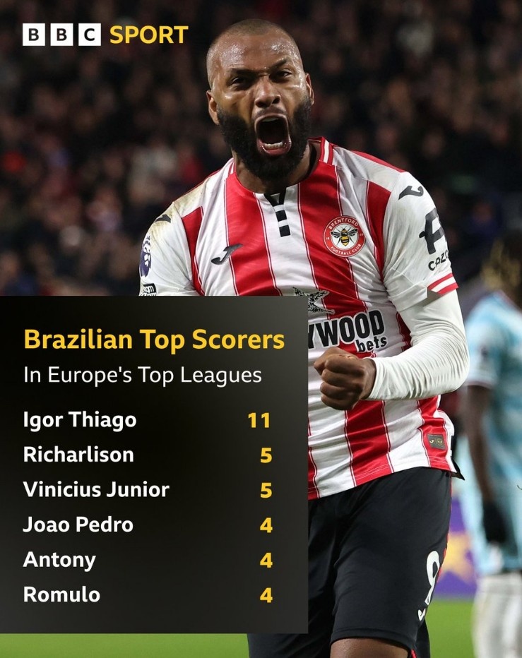 足球比分网11月30日讯 在本轮英超,布伦特福德3-1击败伯恩利,伊戈尔·蒂亚戈梅开二度。 以下为五大联赛巴西球员本赛季射手榜: 1、伊戈尔·蒂亚戈 11球 2、里沙利松、维尼修斯 5球 4、若昂·佩德罗、安东尼、罗慕洛 4球