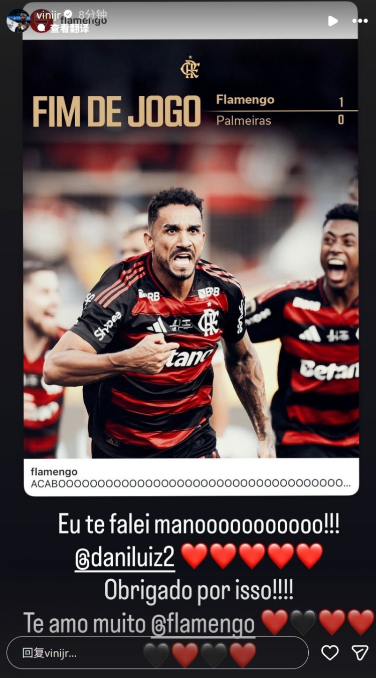 维尼修斯社媒转发海报祝贺老东家弗拉门戈夺冠