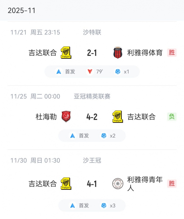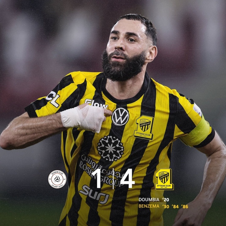 足球比分网11月30日讯 今日凌晨,沙王冠1/4决赛,吉达联合4-1战胜利雅得青年人,成功晋级四强。 本场比赛,37岁的本泽马是球队获胜的最大功臣,他在比赛的第30、84、86分钟独进3球,上演帽子戏法,帮助球队取得大胜晋级。 据统计,这是本泽马生涯第17个帽子戏法,也是他加盟吉达联合后的第4次戴帽。 本泽马已经37岁,两年前的夏窗他告别皇马,自由身加盟吉达联合,至今已为球队出场74次,贡献46球17助,身价随着年龄增长降至700万欧。近3场比赛,本泽马为吉达联合狂轰6球,分别为联赛1球、亚冠精英联赛2球、沙王冠淘汰赛3球。