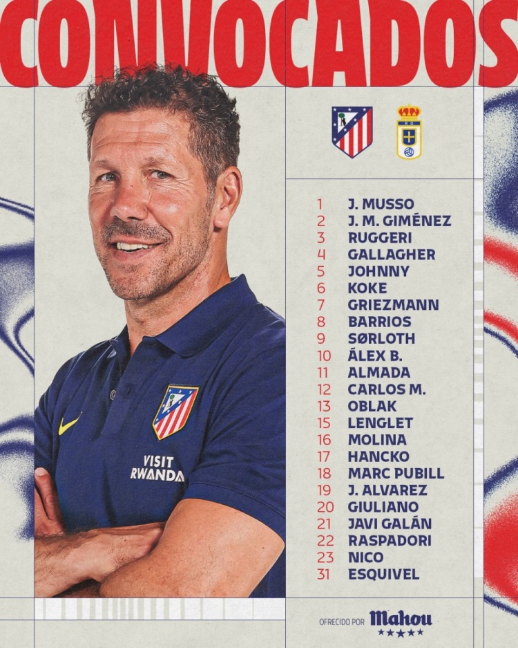 马竞本轮西甲大名单:阿尔瓦雷斯、格列兹曼在