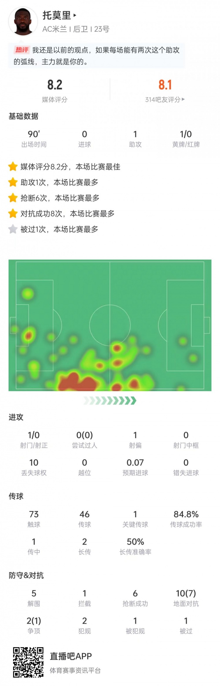 托莫里本场数据:送出助攻,抢断6次+解围5次,