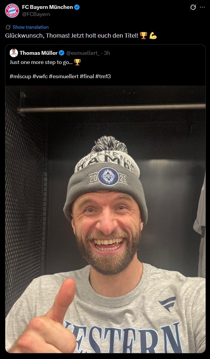 足球比分网11月30日讯 美职联分区决赛,温哥华白浪击败圣地亚哥FC进入总决赛,拜仁旧将穆勒将随队参赛争夺冠军。 拜仁官方社媒祝福穆勒:恭喜托马斯!现在去拿下冠军吧! |