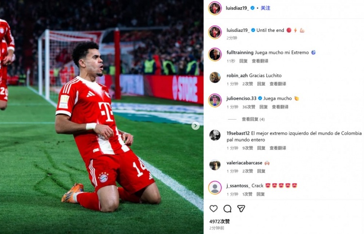 足球比分网11月30日讯 拜仁在本轮德甲3-1逆转圣保利,迪亚斯在本场比赛表现抢眼传射建功。 第44分钟,金玟哉送出精准长传,迪亚斯禁区内倒地完成做球,格雷罗顺势撩射破门。 第90+3分钟,基米希右路传中落点精准,迪亚斯包抄抢点头球破门。 他也在赛后通过社媒晒出自己的滑跪庆祝照,并配文:“战斗到最后一刻! |