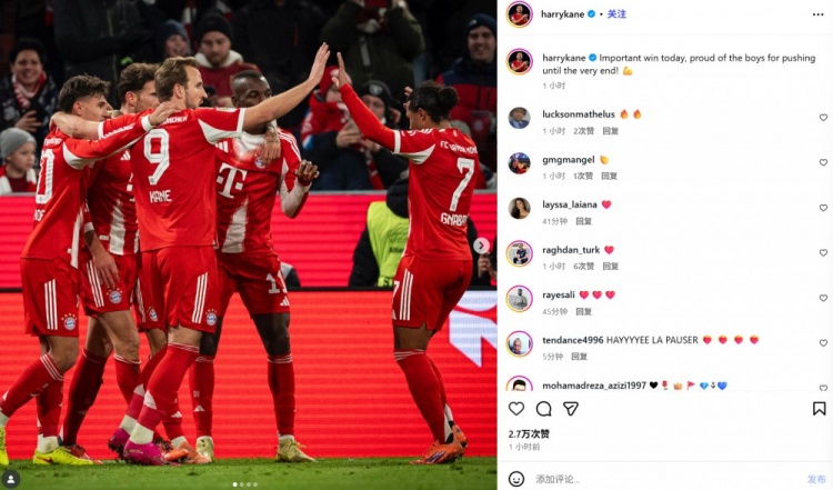 凯恩社媒庆祝:重要的胜利,为小伙子们坚持到