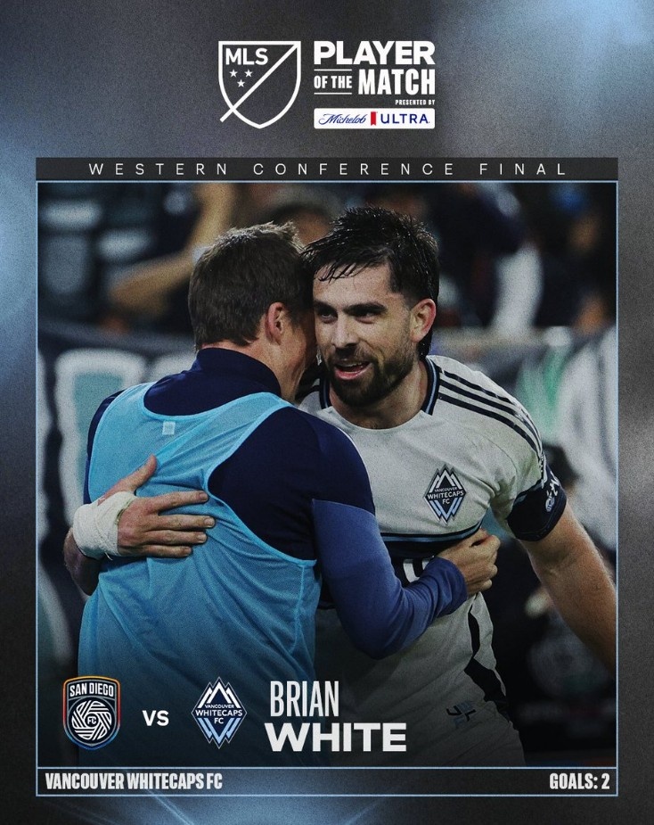 足球比分网11月30日讯 在美职联分区决赛,温哥华白浪3-1击败圣地亚哥FC。 本场比赛温哥华白浪前锋布莱恩·怀特发挥出色,梅开二度,助球队晋级总决赛,赛后他也当选美职联官方评选出的本场最佳球员。 |