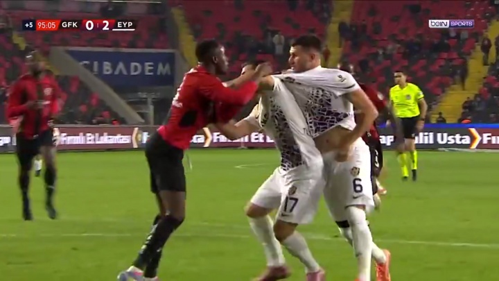 足球比分网11月30日讯 土超第14轮比赛,加济安泰普1-2不敌埃尤普体育。 本场比赛伤停补时最后时刻出现非常离谱的一幕,两队球员在禁区内发生冲突,随后冲突升级多人参与劝架。但是裁判对此完全没有表示,比赛并未暂停,加济安泰普球员博阿滕此时打空门得手。进球后裁判示意中圈开球,冲突随后渐渐停止,裁判没有做出任何判罚,一张牌没出。 冲突结束后,因为进球有效比赛重新中圈开球,皮球开出全场比赛也随之结束,加济安泰普1-2不敌埃尤普体育。